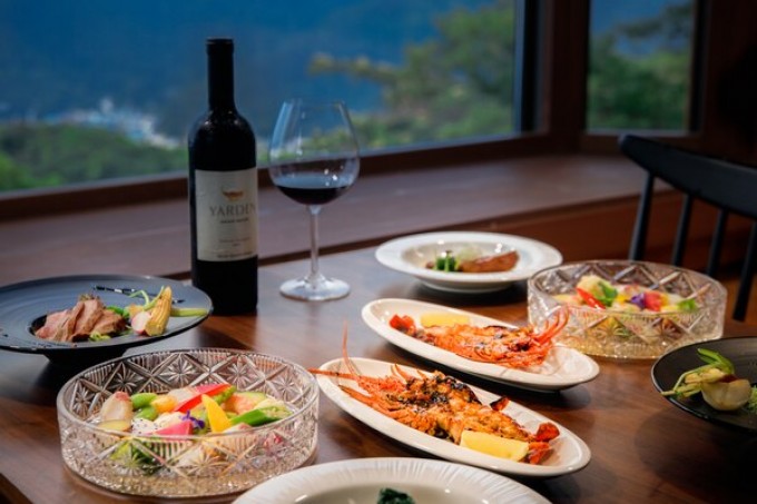 ご夕食はお部屋は全室露天風呂付で湯船につかりながら雄大な駿河湾越しの富士山、西伊豆の美しい夕陽を眺むことが出来ます。