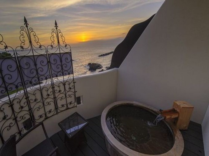 どのお部屋にも、海と夕陽を一望するテラスに、樽露天風呂と十分なスペースの洗い場をご用意(室内バスも完備)
